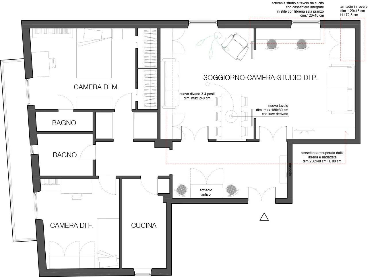 Come trasformare un soggiorno doppio in una camera-studio? Priscilla desiderava un ambiente flessibile che di giorno potesse essere vissuto da tutti come soggiorno e da lei come piccola sartoria domestica, e che di notte potesse diventare una camera da letto con la giusta riservatezza.