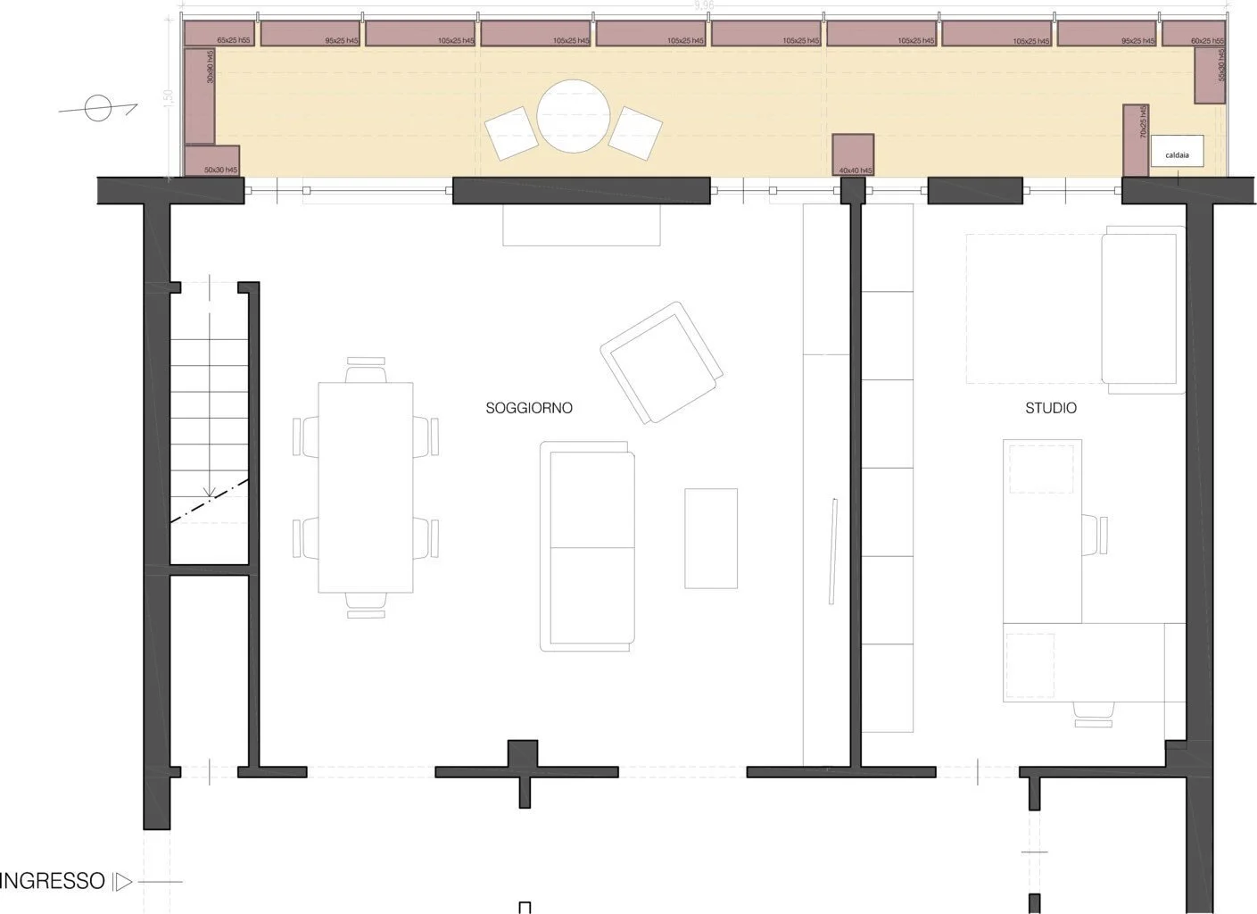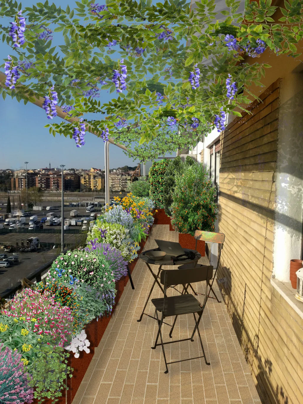 Le zona giorno e la zona studio interne sono state riportate anche nello spazio esterno della casa. Attraverso il posizionamento tra le due zone di un arbusto dal fogliame leggero come il Melograno, e di due differenti rampicanti che crescono su una struttura leggera, infatti, si ricrea la sensazione di avere più ambienti in un unico balcone, nonostante la larghezza ridotta.