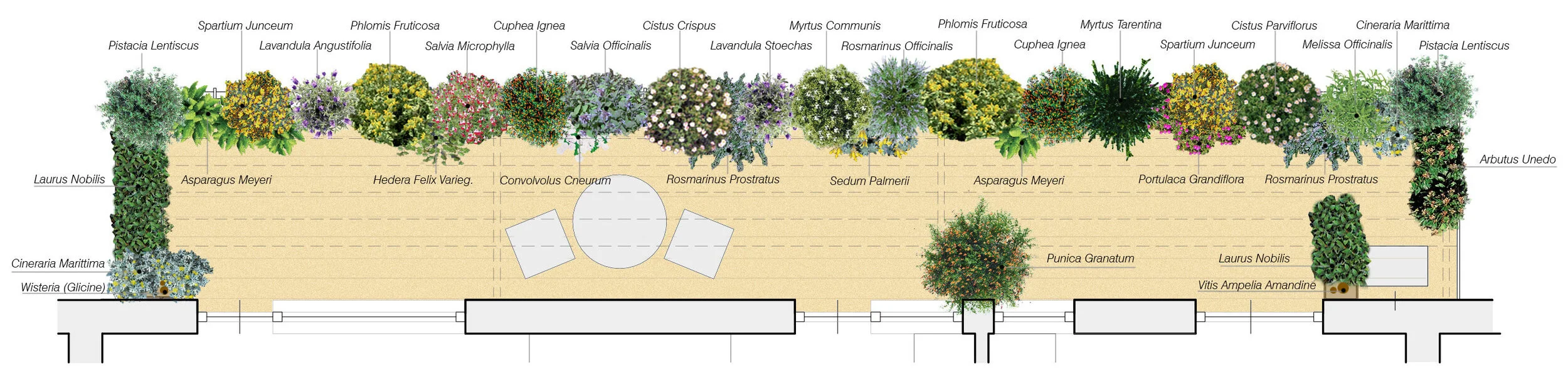 Abbiamo sviluppato il progetto prediligendo quasi del tutto essenze mediterranee, di dimensioni ridotte nelle fioriere a ridosso della ringhiera, e arbusti più grandi per coprire le pareti di confine e la zona della caldaia, che diviene così una piccola zona di ripostiglio.