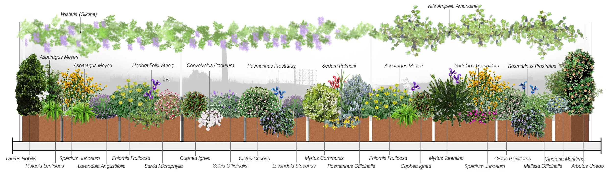 Tra le esigenze principali dei clienti vi era la necessità di coprire la ringhiera per evitare la sensazione di vertigini quando si sta vicino al bordo, data l’altezza del piano. Il sole battente dell’ovest, il vento e un pollice verde ancora agli albori, implicavano la scelta di essenze rustiche e resistenti e che non avessero bisogno di eccessiva manutenzione né di frequenti irrigazioni.