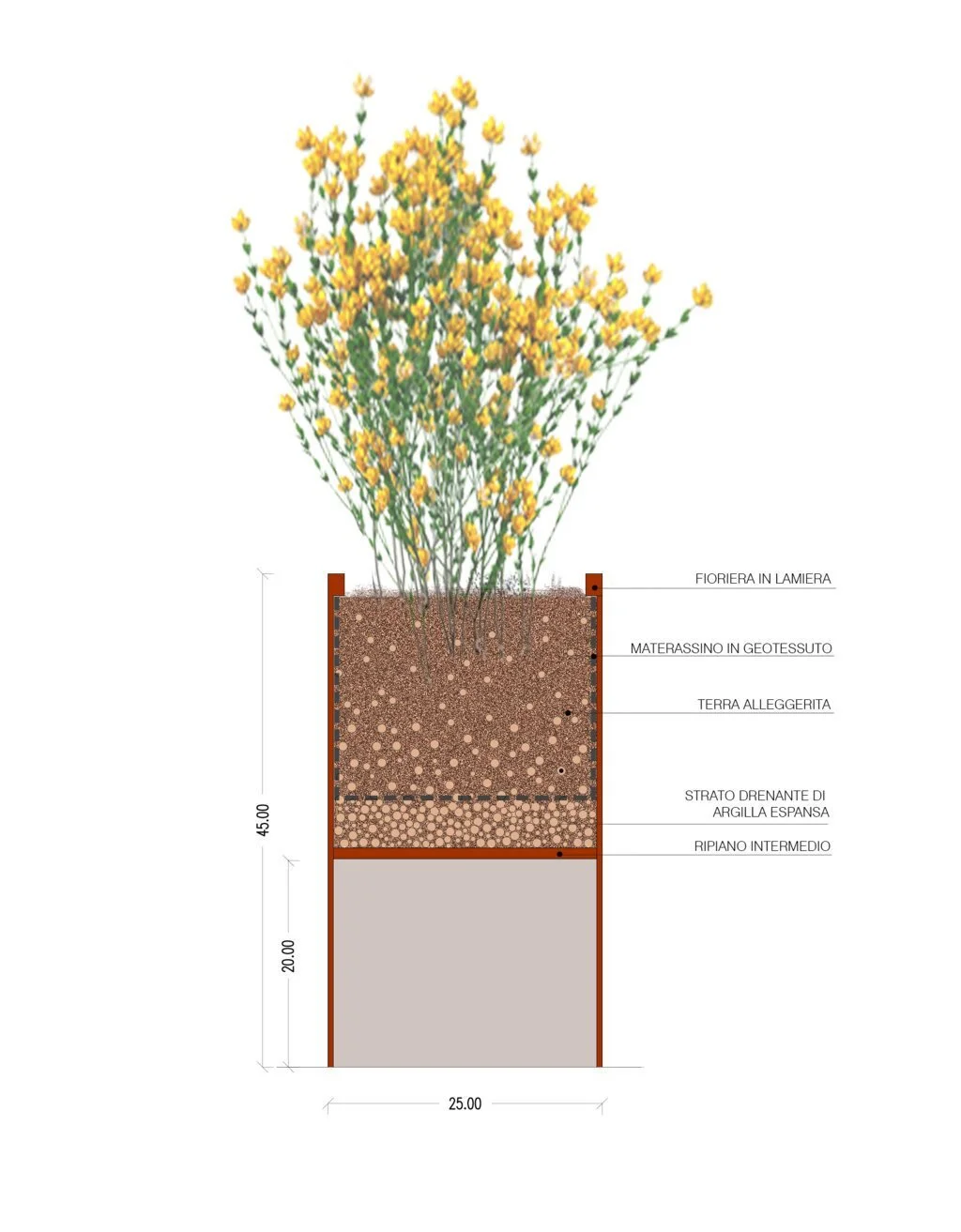 Le fioriere esistenti in cemento sono state sostituite con fioriere in lamiera leggera, posizionate lungo tutto il perimetro. Per non gravare sul peso del balcone queste sono state progettate con dei ripiani sollevati da terra in modo da diminuire la quantità di terriccio da porvi.
